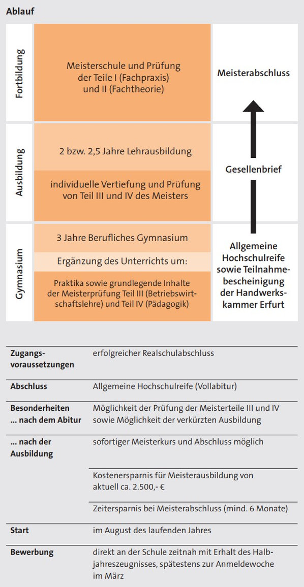 Das neue, zusätzliche Bildungsangebot wird über eine Kooperation zwischen dem Staatlichen Berufsschulzentrum „Hugo Mairich“ und dem Staatlichen Berufsschulzentrum Gotha-West umgesetzt, das schon jetzt ein berufliches Gymnasium anbietet. Ziel ist es, dem Fach- und Führungskräftebedarf im Thüringer Handwerk entgegenzuwirken und gleichzeitig dem steigenden Trend zum Abitur gerecht zu werden.